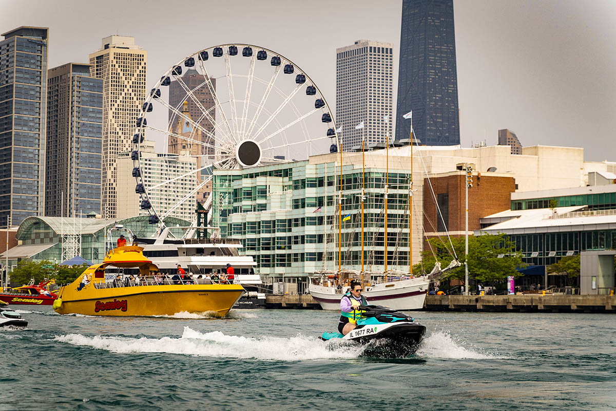 Alvean is a Sea-Doo ambassador, has ridden Sea-Doos and other powersports vehicles all over the world. This trip, however, was her first time seeing the city of Chicago by water. The event was organized in collaboration with Next Wave Powersports and Uncharted Society, a program backed by BRP (Sea-Doo’s parent company) to encourage outdoor exploration via motorsports and powersports. Uncharted Society works with a variety of outdoor outfitters and adventure companies to curate tours and trips on various BRP vehicles, which also include Ski-Doo snowmobiles and Can-Am three-wheelers and all-terrain vehicles. Uncharted Society adventures are available around the world with select partners, and can vary from a half-day equipment rental to multi-day tours.